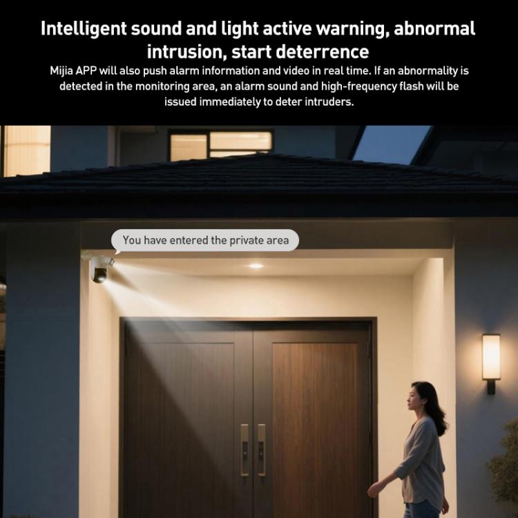9. Intelligent sound and light active warning, abnormal intrusion, start deterrence: If the monitoring area detects an abnormality, an alarm sound and high-frequency flash will be immediately issued to deter the intruder. The Mijia APP will also push alarm information and video in real time.