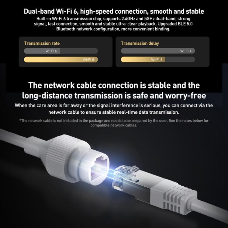 7. Dual-band Wi-Fi 6, high-speed connection, smooth and stable: Built-in Wi-Fi 6 transmission chip, supports 2.4GHz and 5GHz dual-band, strong signal, fast connection, smooth and stable ultra-clear playback. BLE 5.0 Bluetooth network configuration, more convenient binding.
