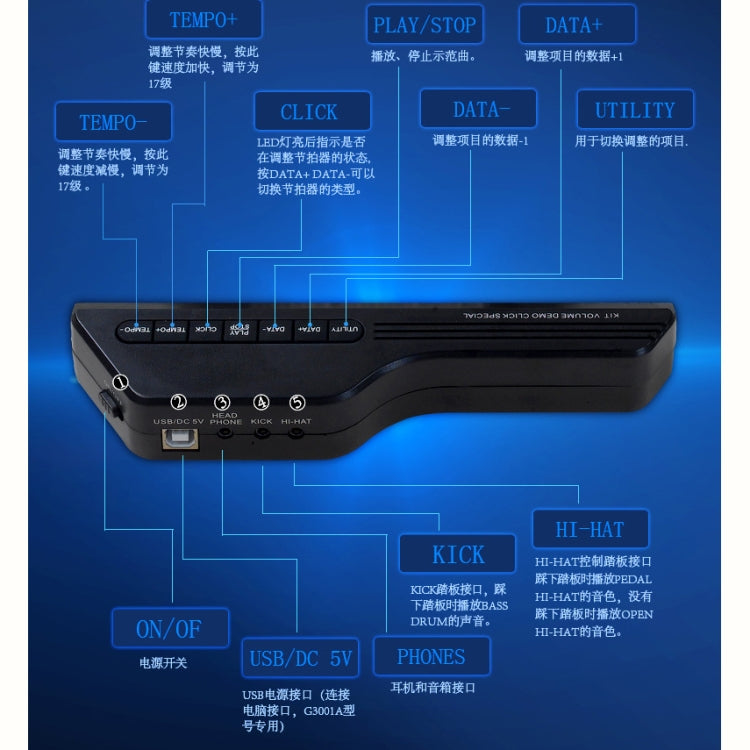 3. Hi-hat using the pedal control to simulate the real hi-hat effect, there are closed, open, pedal hi-hat sound effects.