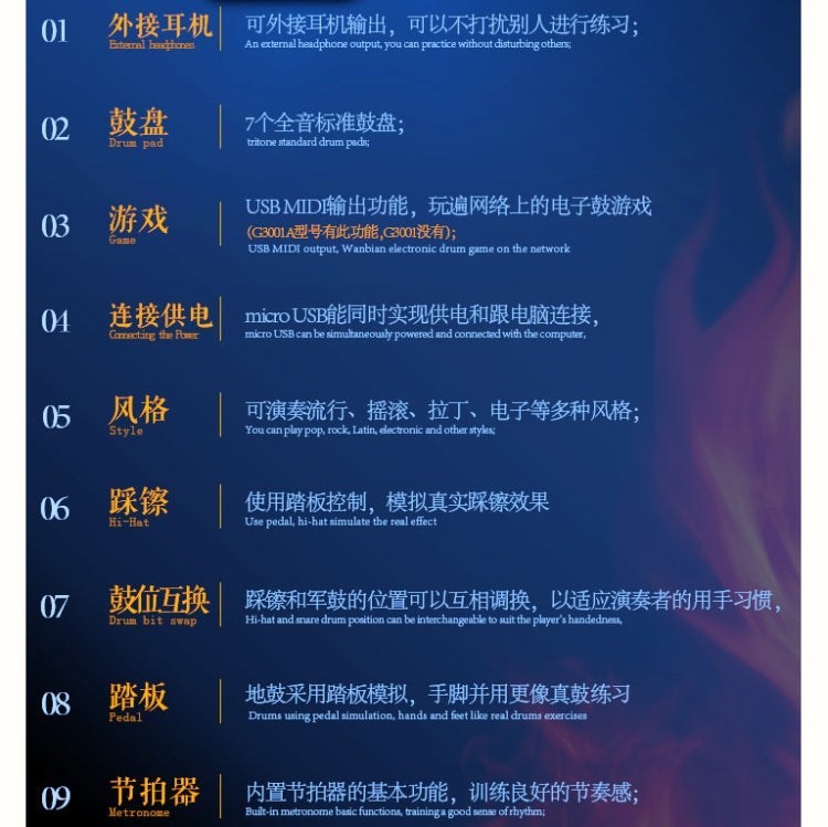 2.With 7 silicon drum pads including Tom/Snare/Hi-Hat/Crash/Ride, making excellent sounds and simulating real beating effect.
