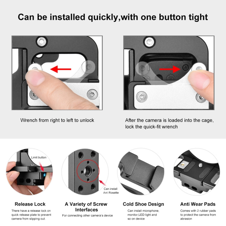 3. Expansion: This cage comes with multiple mounting points, such as 1/4 inch & 3/8 inch threaded holes, cold shoe and 3/8 inch locating holes, allow you to attach more accessories. With a built-in Arca quick release system, the cage allows the fast switch between tripod shooting, handheld shooting, and gimbal shooting.