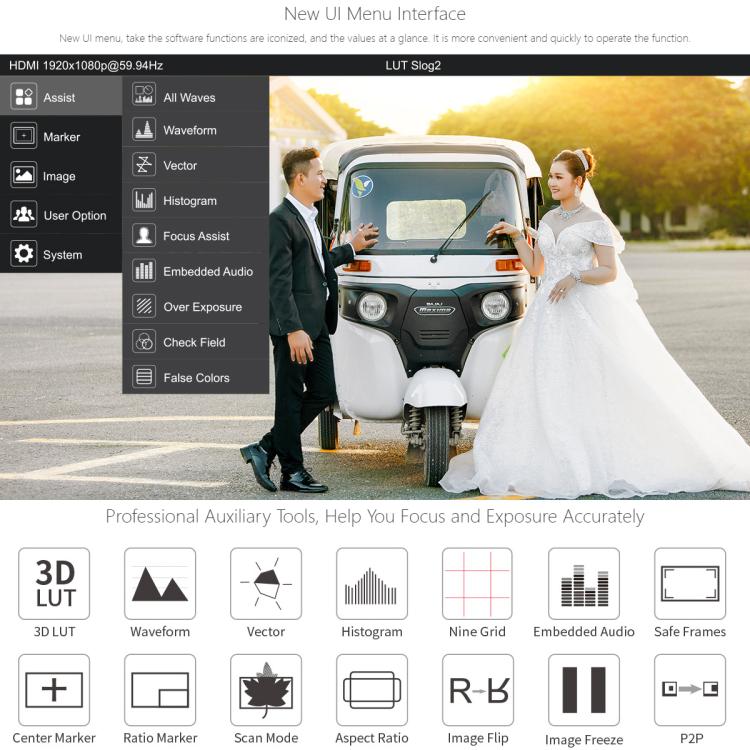 6. With Waveform, Vectorscope, RGB Histogram, Focus Assist, Monochrome etc. functions, can help you accurately exposure and focus every shot.