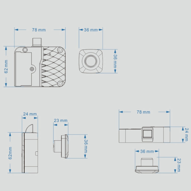 7. Dimensions: 78x24x62mm, 36x23x36mm