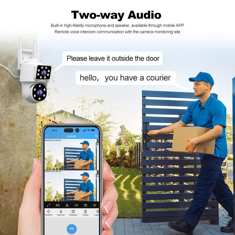 8. Dual-lens Panoramic Monitoring: Simultaneously monitor two different areas. The fixed + pan-tilt dual-lens design enables multi-angle panoramic monitoring.