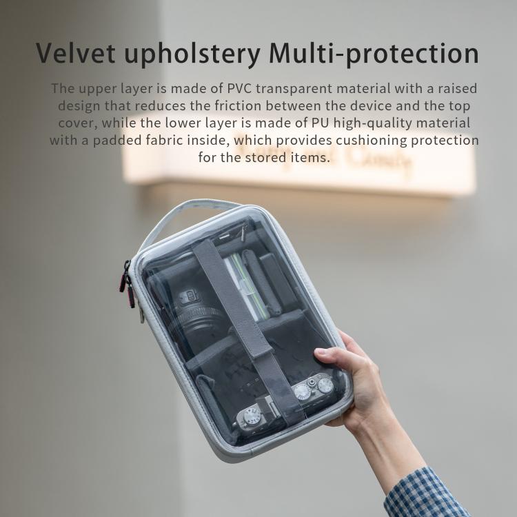 Suggestion: The partitions of the storage bag can be assembled at will, and can be freely combined according to the size of micro single camera, Pocket3, Action series camera, gopro camera, and shadow stone camera. It can also be displayed in combination with camera + daily necessities; the visual design tends to be fashionable, and you can also clearly see what items you brought, which is convenient for inspection when going out, and to a certain extent, subway security inspection is also more convenient. These can be used as selling points to display