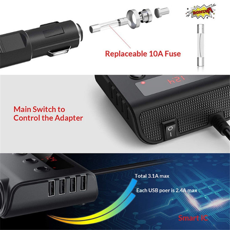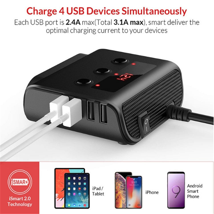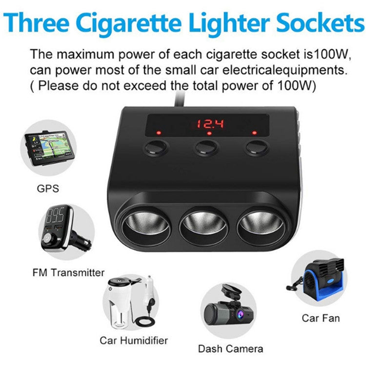 TR12 100W Car Cigarette Lighter One Drag Three With Switch Voltage Display 4USB Car Cigarette Lighteri