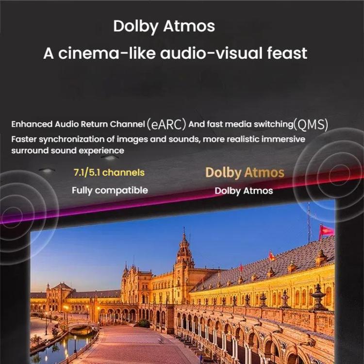 3. Sound quality: support multiple audio streams, 32 audio channels, automatic audio and video synchronization, 1536kHz audio sampling rate, enhanced audio return channel (eARC), support multiple audio streams