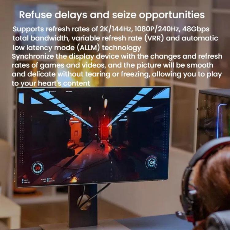 3. Supports refresh rates such as 2K/144Hz, 1080P/240Hz, 48Gbps total bandwidth, variable refresh rate (VRR) and automatic low latency mode (ALLM) technology, synchronizes the display device with the changes and refresh rates of games and videos, and the picture is smooth and delicate, and no tearing/stuttering