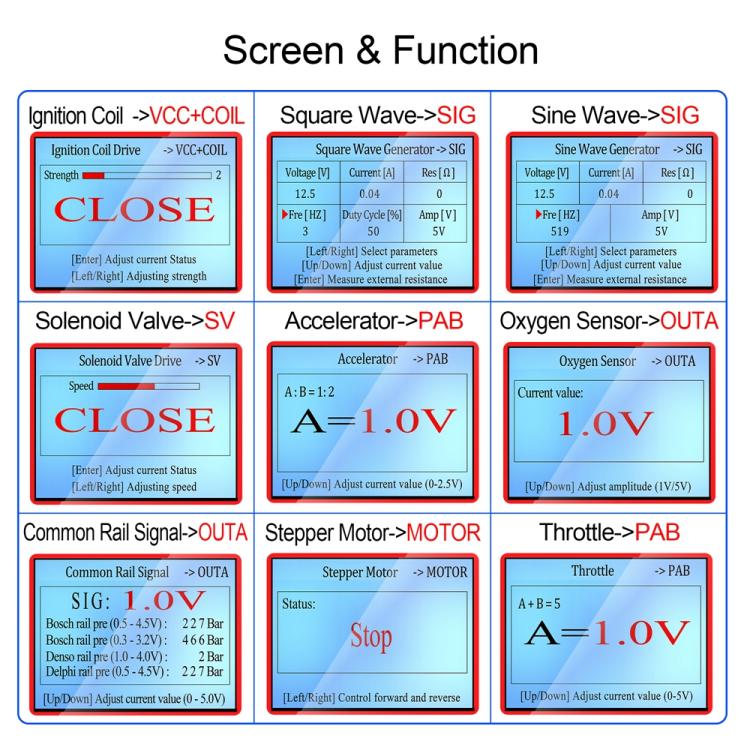 2. Simulates Real Working Conditions: Allows controlled testing of components such as throttle valves, EGR valves, turbo actuators, solenoid valves, etc.