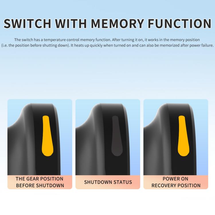 4. The switch has a temperature control memory function. It starts in the memorized setting (the setting before shutting down) and heats up quickly.